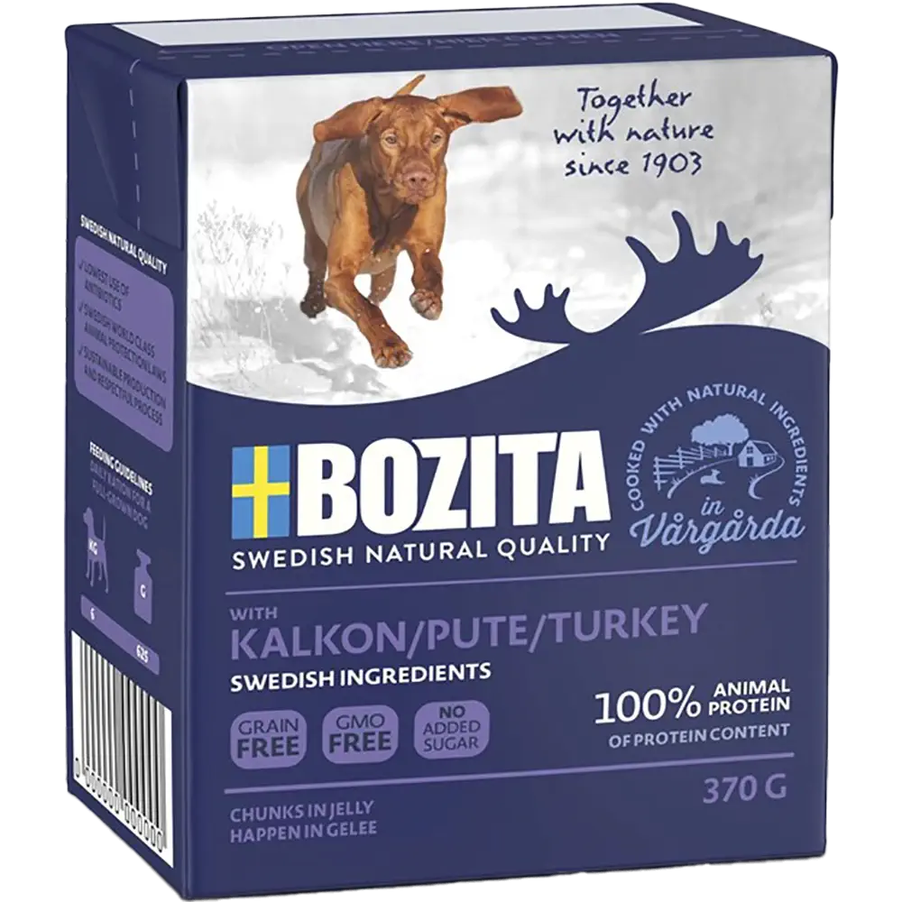 Bozita Bitar i Gelé med Kalkon är ett välsmakande helfoder som är speciellt framtaget för att tillfredsställa hundens naturliga behov av protein