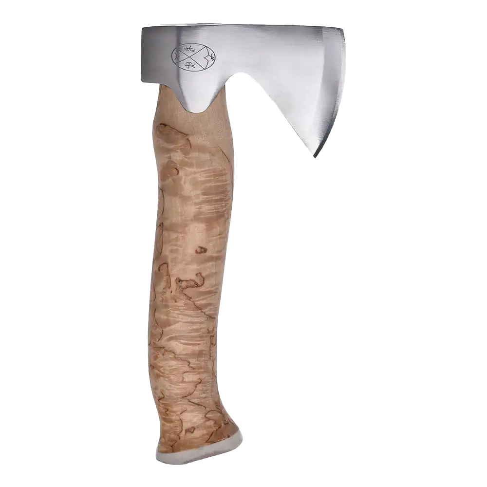 Karesuando Unna Áksu Natur: Handtillverkad jaktyxa i masurbjörk och rostfritt stål. Kompakt, exklusiv och praktisk för jägare och friluftsliv.