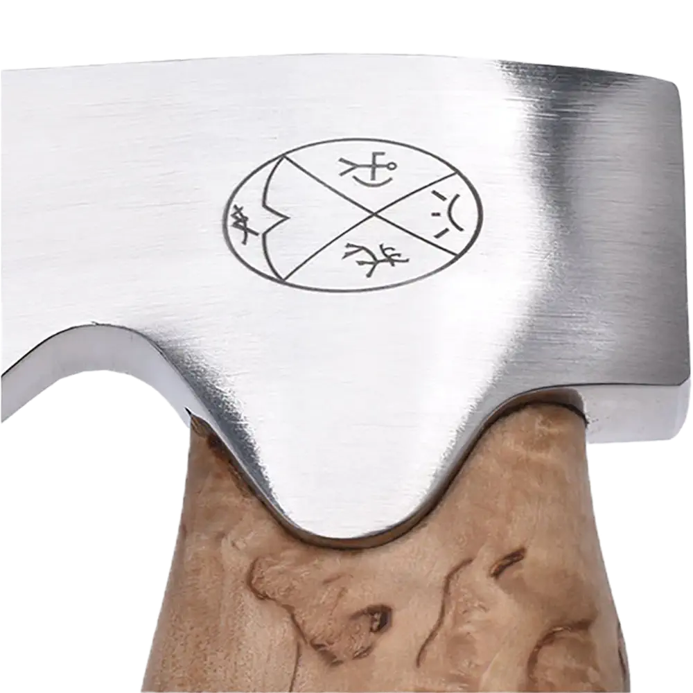 Yxhuvudet är tillverkat av högkvalitativt rostfritt stål, härdat till 54 HRC, vilket ger en egg som är både extremt vass och enkel att underhålla. Det vackra skaftet är tillverkat av oljad masurbjörk och pryds av en dekorativ älgshornsdetalj i änden, vilket ger varje yxa ett unikt och naturligt utseende. Tack vare den genomtänkta utformningen ligger yxan stadigt och säkert i handen, även i våta förhållanden.